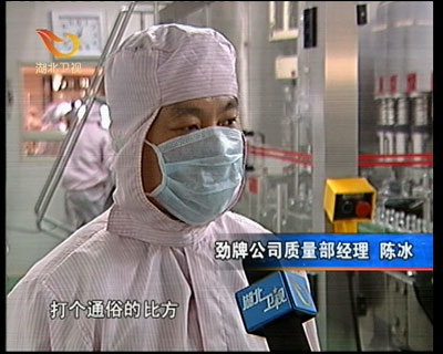 勁牌公司質量部經理 陳冰 :" 我們這里的衛生要求是10萬級別的 ,打個通俗的比方, 就相當于外科器官移植手術的隔離要求。 "