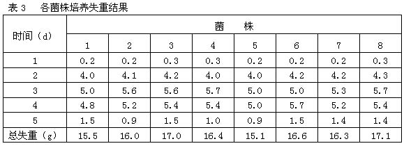 將活化的8支菌液分別吸取10ml接入平行進(jìn)行的500ml的帶發(fā)酵栓的磨口三角瓶中。每只三角瓶內(nèi)裝200ml米曲汁,稱重,并記錄原始重量。而后保溫28℃發(fā)酵,逐日觀察發(fā)酵情況,同時稱重記錄,以了解發(fā)酵速度及失重情況,待發(fā)酵終止時稱重計算總失重,并對發(fā)酵進(jìn)行全面分析(見表3、表4)。