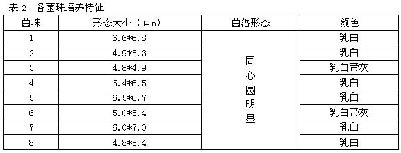 將8支菌株的斜面菌接種于麥芽汁中培養(yǎng),經(jīng)2-3次活化后,觀察形態(tài)、出芽情況、測定大小。試驗結(jié)果見表2。
