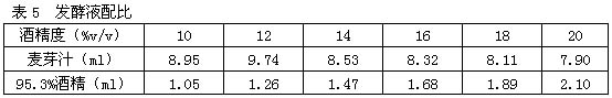 取杜氏發(fā)酵管,按不同編號加入所需液量,先取麥芽汁加入杜氏管中,100KPa壓力滅菌30分鐘,在無菌條件下加入酒精,放置3天,使酒精擴散均勻,其配比見表5。