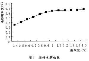 酒糟通常酸度很高,有時含有不溶性沉淀物,過濾除雜后,一部分可適合于糖化醪調酸,另一部分用于水解重新利用,調PH5.0,調溫度為42℃。由圖1可知,隨著酶濃度的提高,還原糖的濃度也在不斷地提高,但酶濃度添加到1%時,還原糖的濃度升高接近穩(wěn)定并達到0.65%左右,因此在發(fā)酵中一般選擇的濃度為1%。