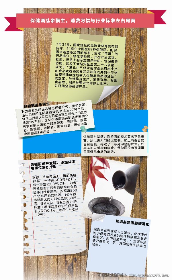 國家食品藥品監(jiān)管總局的一則通告,將諸多保健酒企業(yè)涉嫌非法添加化學(xué)物質(zhì)的行為曝光天下,知名企業(yè)也涉嫌其中,保健酒行業(yè)的隱秘面紗似乎被揭破。諸多人士認(rèn)為,這個案例對于保健酒行業(yè)的負(fù)面影響力并不亞于當(dāng)年酒鬼酒遭逢的“塑化劑事件”。