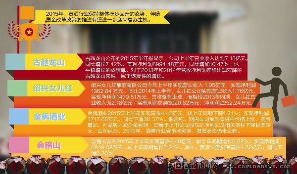 隨著眾酒企2015年中報(bào)的出爐,酒行業(yè)逐漸走出低迷呈回暖態(tài)勢,步入正常增長軌道。2015年,黃酒行業(yè)保持整體穩(wěn)步回升的態(tài)勢,并伴隨國企改革政策的推進(jìn)有望進(jìn)一步迎來復(fù)蘇生機(jī)。