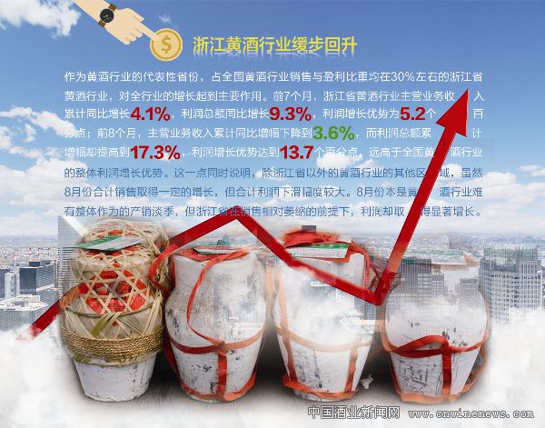 來自中國輕工業(yè)網(wǎng)的數(shù)據(jù)顯示,處于恢復期的黃酒行業(yè),今年8月份出現(xiàn)一股恢復高潮,與前7個月相比,前8個月主營業(yè)務收入累計同比增幅由5.8%上升到6%,利潤總額累計同比增幅由10.3%上升到11.4%,全行業(yè)銷售雖然繼續(xù)保持平穩(wěn)增長,但利潤增幅相對較大。前8個月黃酒行業(yè)利潤增速領(lǐng)先于銷售增速5.4個百分點,這說明在上年黃酒行業(yè)喪失一部分利潤空間后,目前這個空間差正在得到填補。