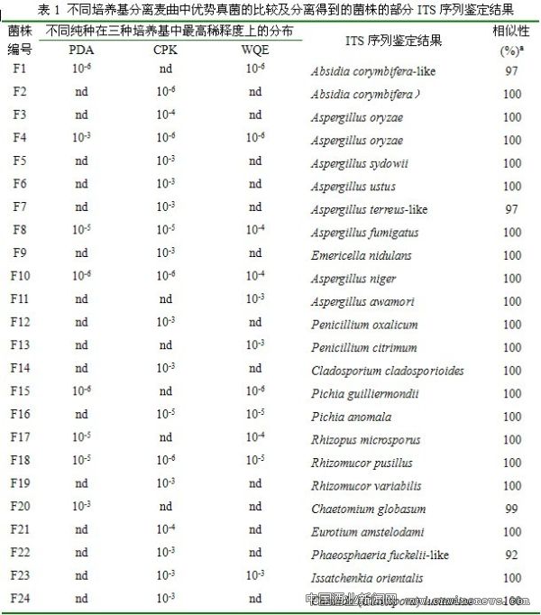 將10—5稀釋度以上檢測到的真菌認為是麥曲樣品中的優(yōu)勢菌。從表中可以看出,不同的培養(yǎng)基分離出來的優(yōu)勢菌是不一樣的,且每一種培養(yǎng)基都能檢測到其它培養(yǎng)基所不能檢測到的優(yōu)勢菌株,所以必須聯(lián)合使用多種分離培養(yǎng)基,才能準確解析麥曲中的真菌多樣性。另外,在分離培養(yǎng)基中有必要加入去氧膽酸鈉來抑制菌絲的蔓延。