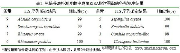 因此,為了更加準確的認識麥曲中的真菌群落結(jié)構(gòu),應該聯(lián)合使用培養(yǎng)法和分子生物學技術(shù)。通過培養(yǎng)法未能得到的序列;由于技術(shù)原因,條帶2未能檢測到。