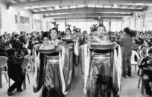 在昨天的開釀儀式上,中國酒業協會黃酒分會理事長、紹興市黃酒協會會長傅建偉誦讀祭文,10余位古越龍山釀酒師傅上香祭拜,祈求2012年冬釀風調雨順,釀出醇香的老酒,釀酒人鄭重宣誓“做誠實人,釀良心酒”。