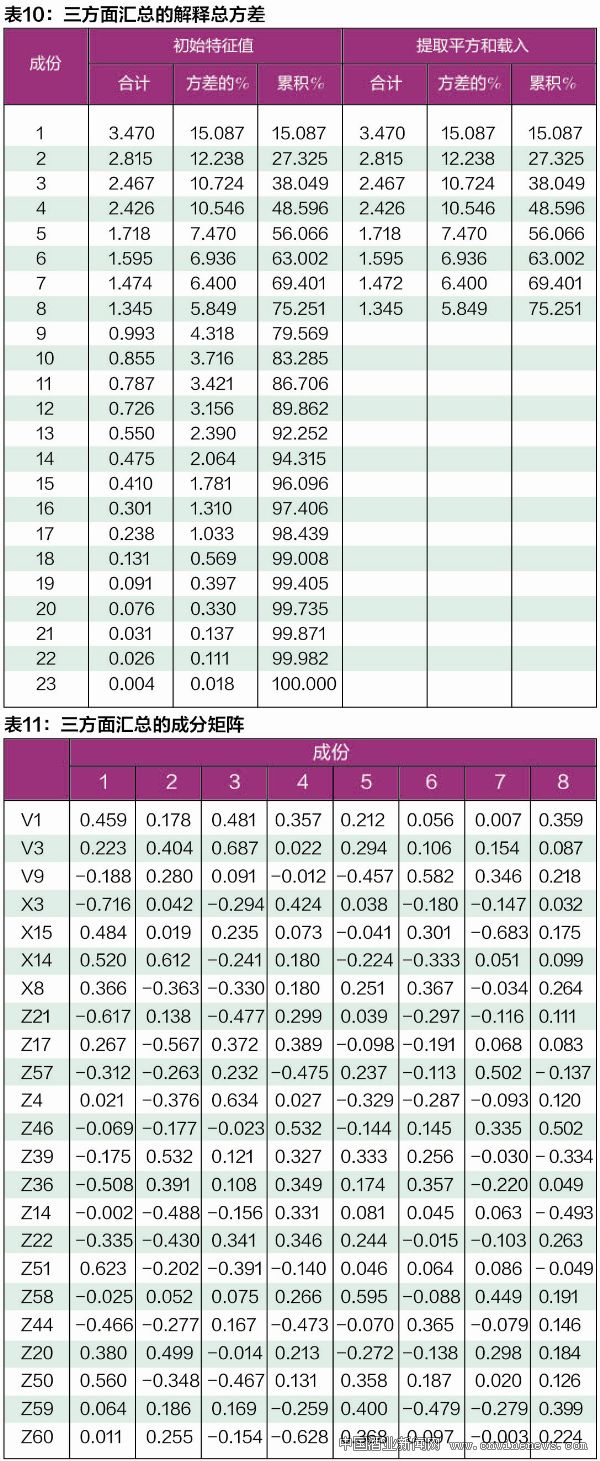 再次,取2.3節的16組對紅葡萄正相關的理化指標(含Z的項)、4組與紅葡萄酒呈現正相關關系的指標(含X的項)與以上3組對芳香物質影響較大的指標(含V的項)共同構成一組數據,并對其進行主分量分析,結果如表10、表11所示。
