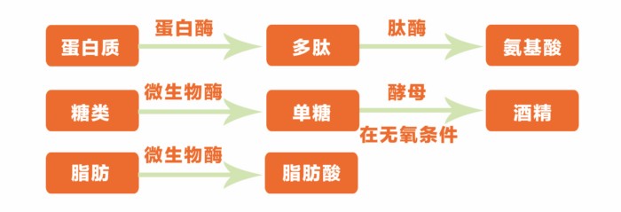 菌系和酶系動態地改變物系。固態發酵過程中,淀粉、蛋白質、脂肪等原料在微生物及其分泌的酶作用下,經過一系列酶解或合成反應,變成醇、醛、酸、酯等。有一種比較形象的說法是“糖化靠霉菌、發酵靠酵母、生香靠細菌”。微生物對原料中蛋白質、糖類、脂肪等的分解過程可概括如圖1。