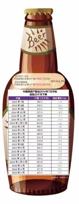 當下啤酒行業(yè)的現(xiàn)狀依舊不容樂觀, 2014年6月,我國啤酒行業(yè)結束了二十年的正增長,產(chǎn)量首現(xiàn)下滑并持續(xù)至今,行業(yè)盈利仍處在尋底過程中。2014年我國啤酒產(chǎn)量同比下降0.96%,2015年的數(shù)字是-5.06%;2016年1~4月是-6.3%。