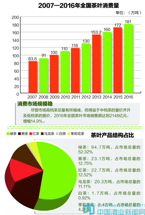 2016年,我國茶葉年消費(fèi)量達(dá)到181萬噸,年增長9萬噸,增長率達(dá)到5.2%;茶葉市場銷售額達(dá)到2148億元,增幅14.9%。預(yù)計(jì)2017年全年,我國茶葉市場消費(fèi)量將達(dá)到187萬噸,消費(fèi)額2280億元。
