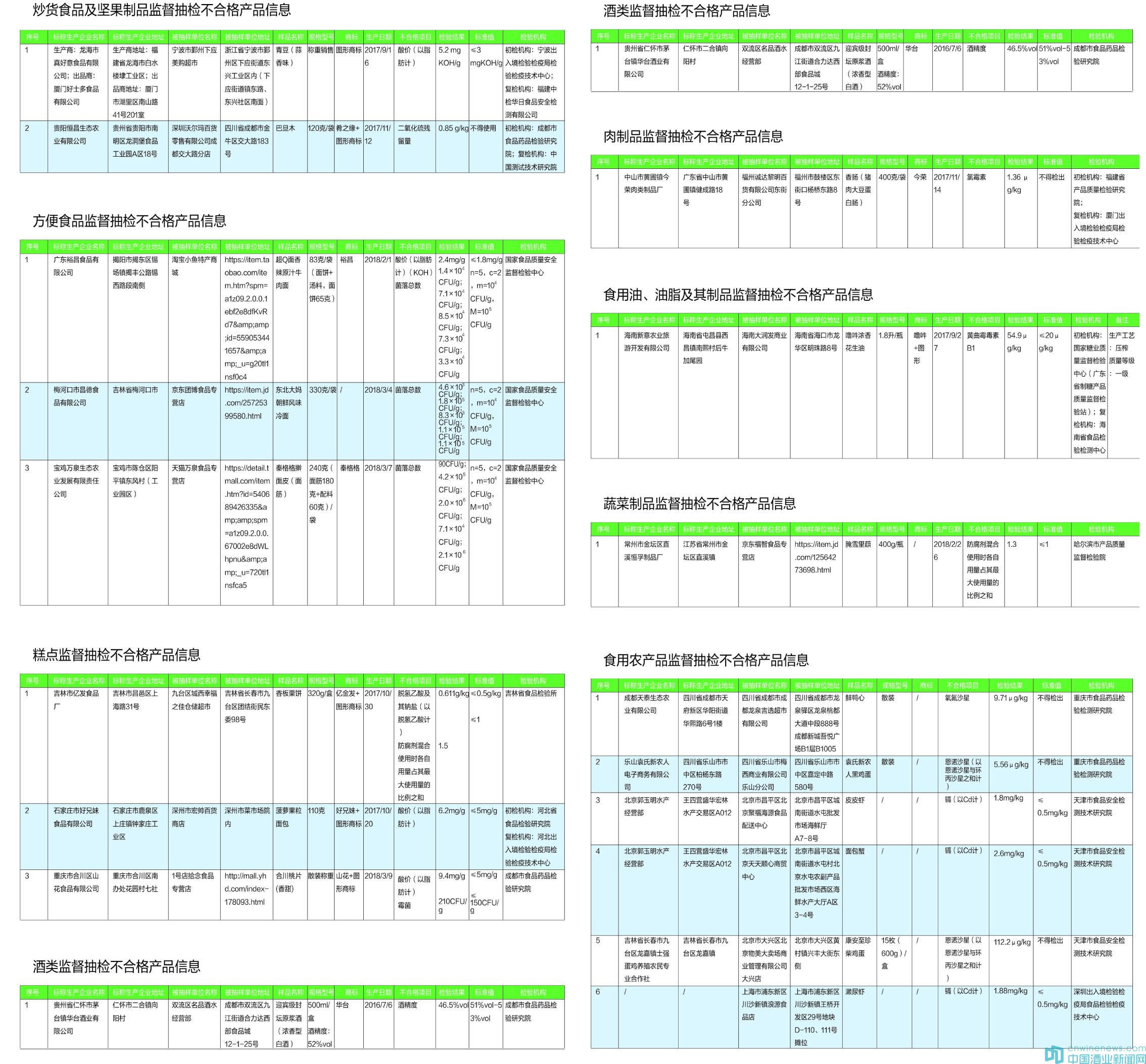 從抽檢的總體情況看,本次抽檢炒貨食品及堅果制品45批次,不合格樣品2批次;方便食品36批次,不合格樣品3批次;糕點26批次,不合格樣品3批次;酒類38批次,不合格樣品1批次;肉制品20批次,不合格樣品1批次;食用油、油脂及其制品18批次,不合格樣品1批次;蔬菜制品113批次,不合格樣品1批次;食用農產品156批次,不合格樣品6批次;蜂產品34批次,水果制品35批次,特殊膳食食品35批次,均未檢出不合格樣品。