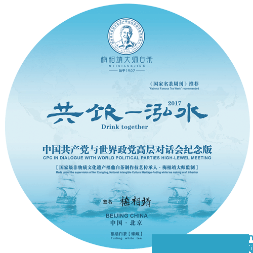 為紀念中國共產黨與世界政黨高層對話會在北京召開,由國家級非物質文化遺產福鼎白茶制作技藝代表性傳承人梅相靖先生監制的“共飲一泓水”——紀念中國共產黨與世界政黨高層對話會紀念版福鼎白茶,于2018年元月上市。作為福鼎白茶傳承人,梅相靖告訴《國家名茶周刊》記者,近年來強烈感受到國家層面對茶業的重視程度前所未有。中國共產黨與世界政黨高層對話會海報《共飲一泓水》和《美美與共、和而不同》在2017年11月24日發布后,梅相靖第一時間就決定以“共飲一泓水”為題,精制福鼎白茶紀念版,表達對國家 “構建人類命運共同體,共同建設美好世界”的主張積極響應,以白茶傳遞 “和而不同”、“和諧相生”、“美美與共”等傳統哲學觀一脈相承的聯系。