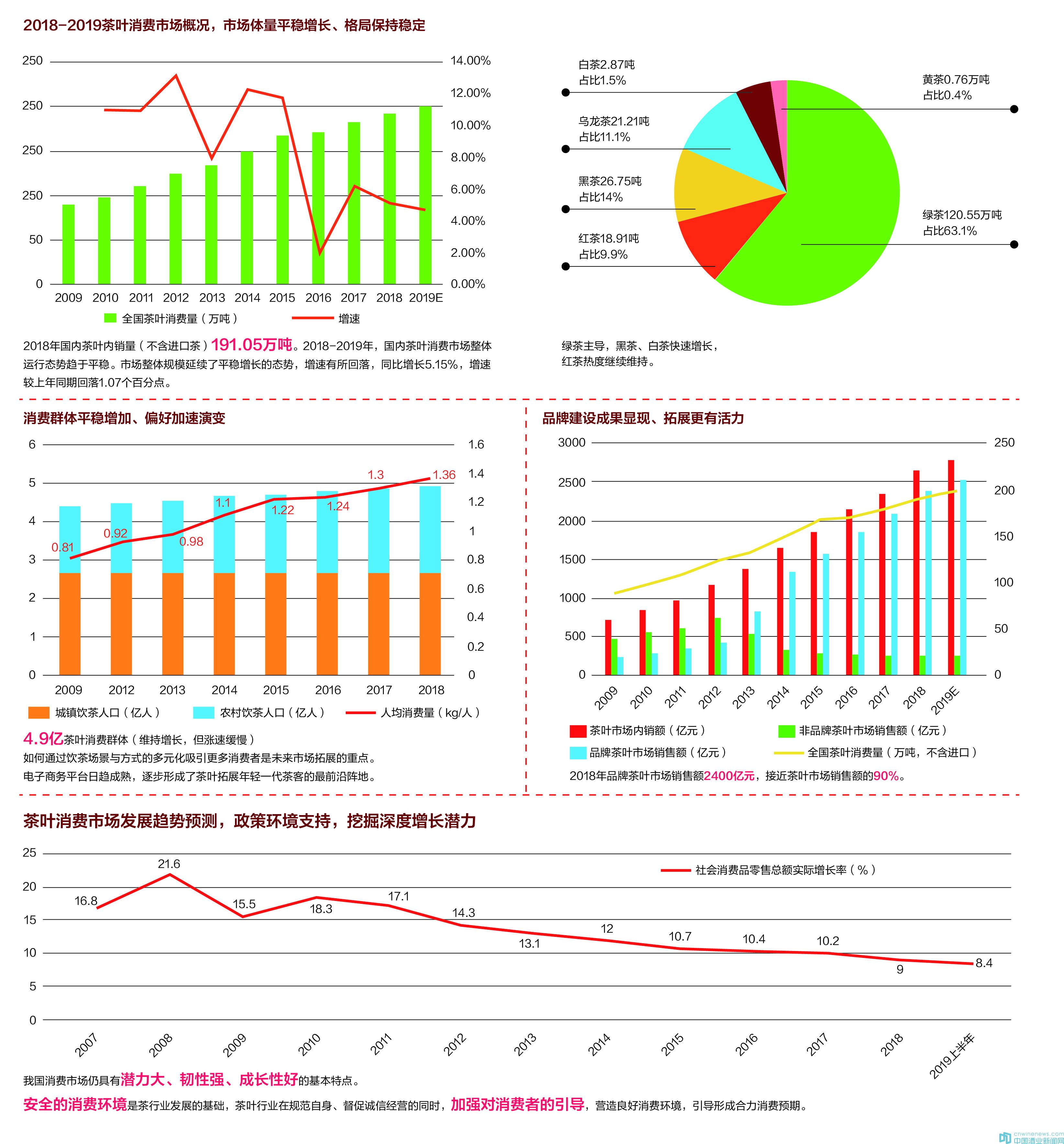 盡管存在各種的問題,但我國消費市場仍具有潛力大、韌性強、成長性好的基本特點,這是茶葉消費板塊在自我變革中健康協調發展的重要基礎和有利環境。黨中央、國務院密集出臺了一系列穩增長、促消費的政策舉措,加快破解制約居民消費最直接、最突出、最迫切的體制機制障礙,進一步激發居民消費潛力。