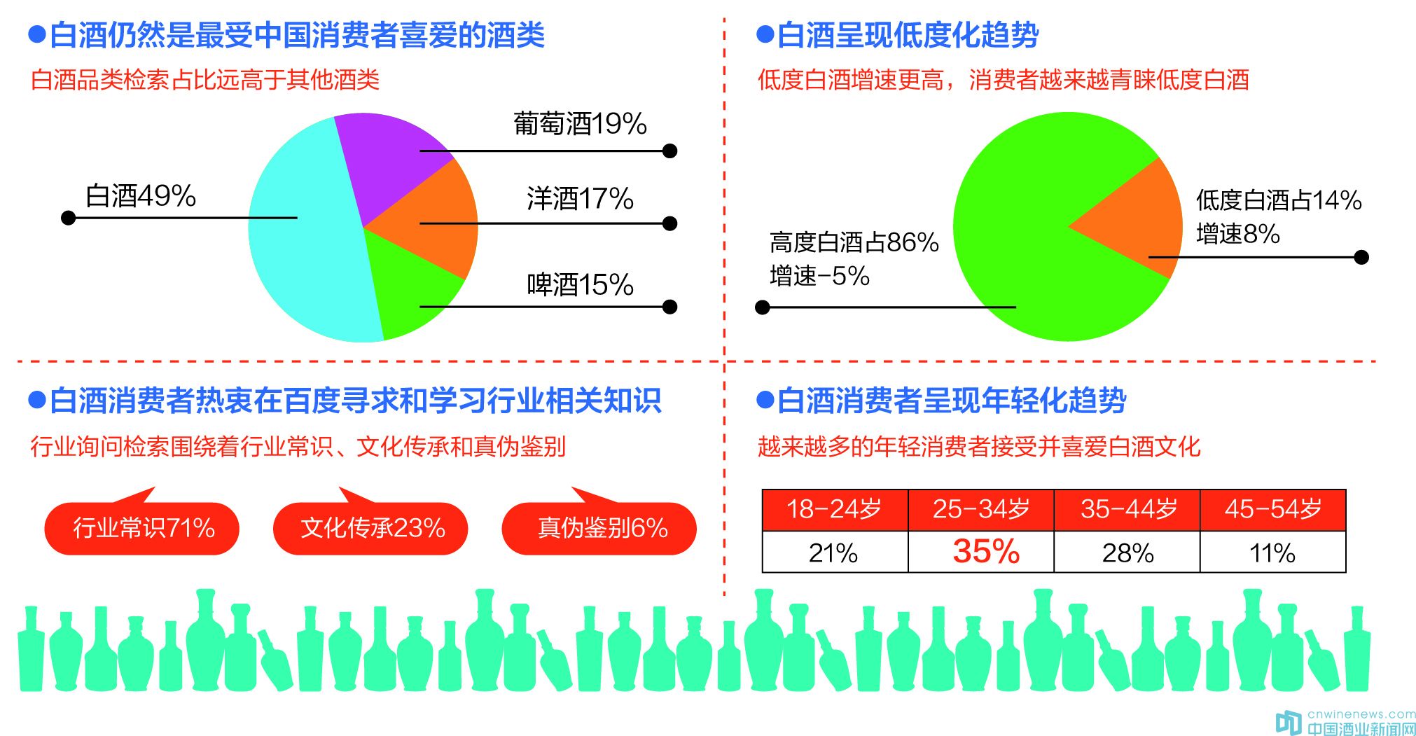 小瓶化是天貓平臺發布報告的一大趨勢,而不久前剛發布的《2019百度白酒行業報告》中則提到白酒消費呈現低度化、專業化、年輕化等趨勢。其中,《報告》指出,消費者在百度檢索中,針對低度白酒的檢索占到14%,增速為8%;對高度白酒的檢索達86%,增速為-5%。同時,提到“白酒消費者呈現年輕化趨勢,越來越多的年輕消費者接受并喜愛白酒文化。其中,在18~54歲的白酒消費者中,25~34歲占比最高,達35%;35~44歲占比達28%;18~24歲占比達21%;45~54歲占比達11%”。