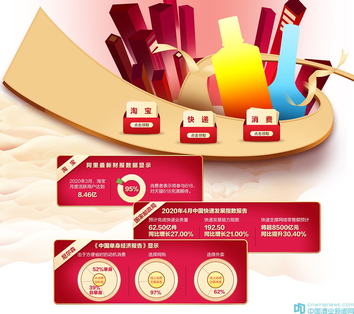 在剛剛過去的全國兩會上,2020年《政府工作報告》提出,要“推動消費回升。支持餐飲、商場、文化、旅游、家政等生活服務業恢復發展,推動線上線下融合。支持電商、快遞進農村,拓展農村消費。”以上具體舉措的提出,無疑是對電商的一大利好,疫情催生了更廣泛的線上購物品類,聚合了更多的網購消費群體,即將到來的“618”年中大促,對于酒業是否意味著可以好好地吆喝一下,實現消費的回補?