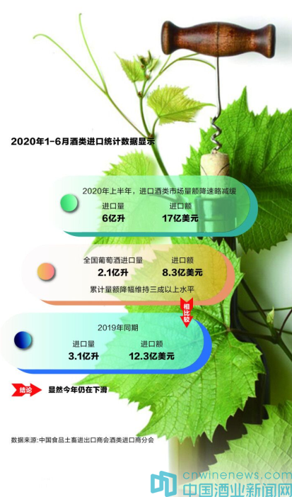 中國食品土畜進(jìn)出口商會酒類進(jìn)口商分會發(fā)布的2020年1~6月酒類進(jìn)口統(tǒng)計(jì)數(shù)據(jù)顯示:今年上半年,進(jìn)口酒類市場量額降速略減緩:進(jìn)口量6億升,進(jìn)口額17億美元。其中,全國葡萄酒進(jìn)口量2.1億升,進(jìn)口額8.3億美元,累計(jì)量額降幅維持三成以上水平。