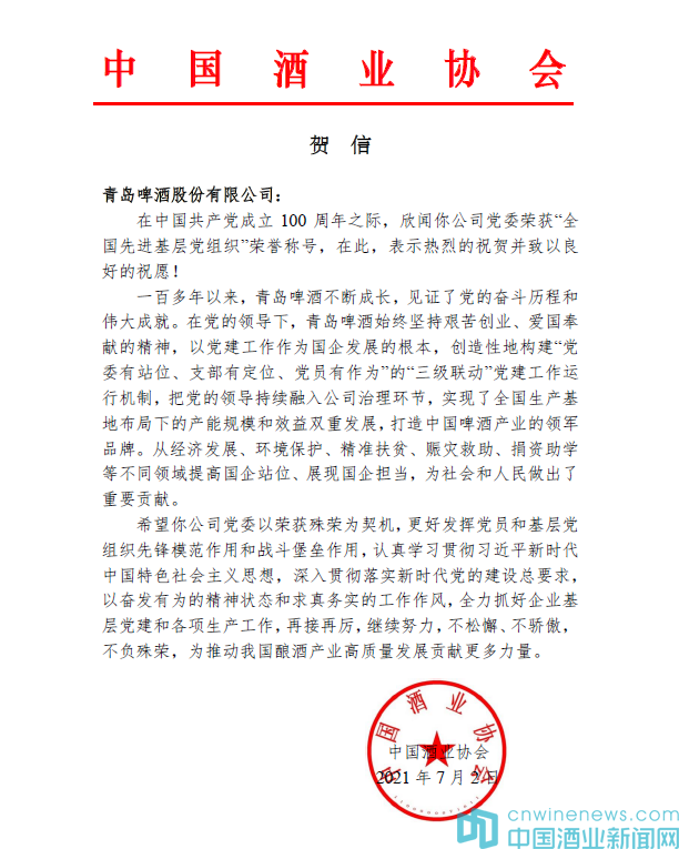 奮斗不止,永葆初心!在中國偉大復興的征程中,在中國酒業高質量發展的永續之路上,還有更多的黨員同志們和基層黨組織,在為實現中華民族偉大復興的中國夢而不懈奮斗。祝愿中國酒業在青島啤酒黨委榜樣力量的引領和帶動下,深入貫徹落實新時代黨的建設總要求,以奮發有為的精神狀態和求真務實的工作作風,全力抓好企業基層黨建和各項生產工作,帶頭攻堅克難,強化使命擔當,為推動我國釀酒產業高質量發展和為社會創造更加美好的生活做出新的更大貢獻。