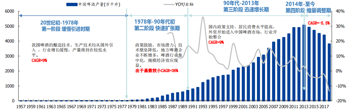 啤酒,作為舶來品,身處水大魚大的中國酒水市場,人口紅利快消品行業的增量邏輯。自改革開放之后開始快速擴張的啤酒也同樣如此,經過30多年的快速擴張以及品牌間的跑馬圈地、巷戰廝殺,行業CR5集中度達到73%,但是自2013年銷量見頂之后,啤酒行業就進入了存量競爭階段,與此同時,我們也看到了如雨后春筍版的諸多精釀啤酒開始走向的大眾桌上,且以每年35%左右的復合增長率成了啤酒行業的“新代言人”。
