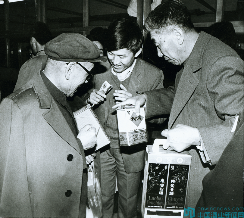 這是新華社記者在1986年全國人民代表大會期間,人民大會堂小賣部前拍攝到的照片。這是與會代表們在小賣部購買名優白酒后互相交流的場面。這幾位代表討論的正是小蓋汾竹禮盒,此酒在當年官方零售價為10元多一點。