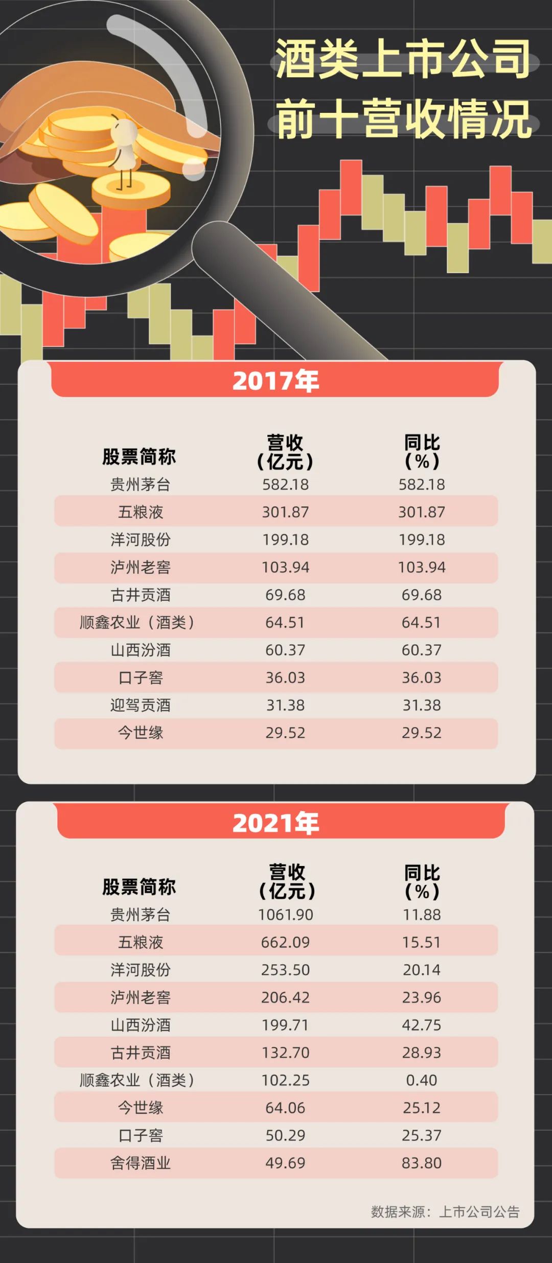 國家統(tǒng)計局發(fā)布的數(shù)據(jù)顯示,2017年,全國規(guī)模以上白酒企業(yè)銷售收入5654.42億元,2021年全年,白酒產(chǎn)業(yè)規(guī)模以上企業(yè)銷售收入6033億元。從以上數(shù)據(jù)可以看出,從2017年到2021年,白酒行業(yè)整體銷售增幅不大,僅有不足400億元的增長,可謂微增,但是上市企業(yè)前十名的增幅變化巨大。