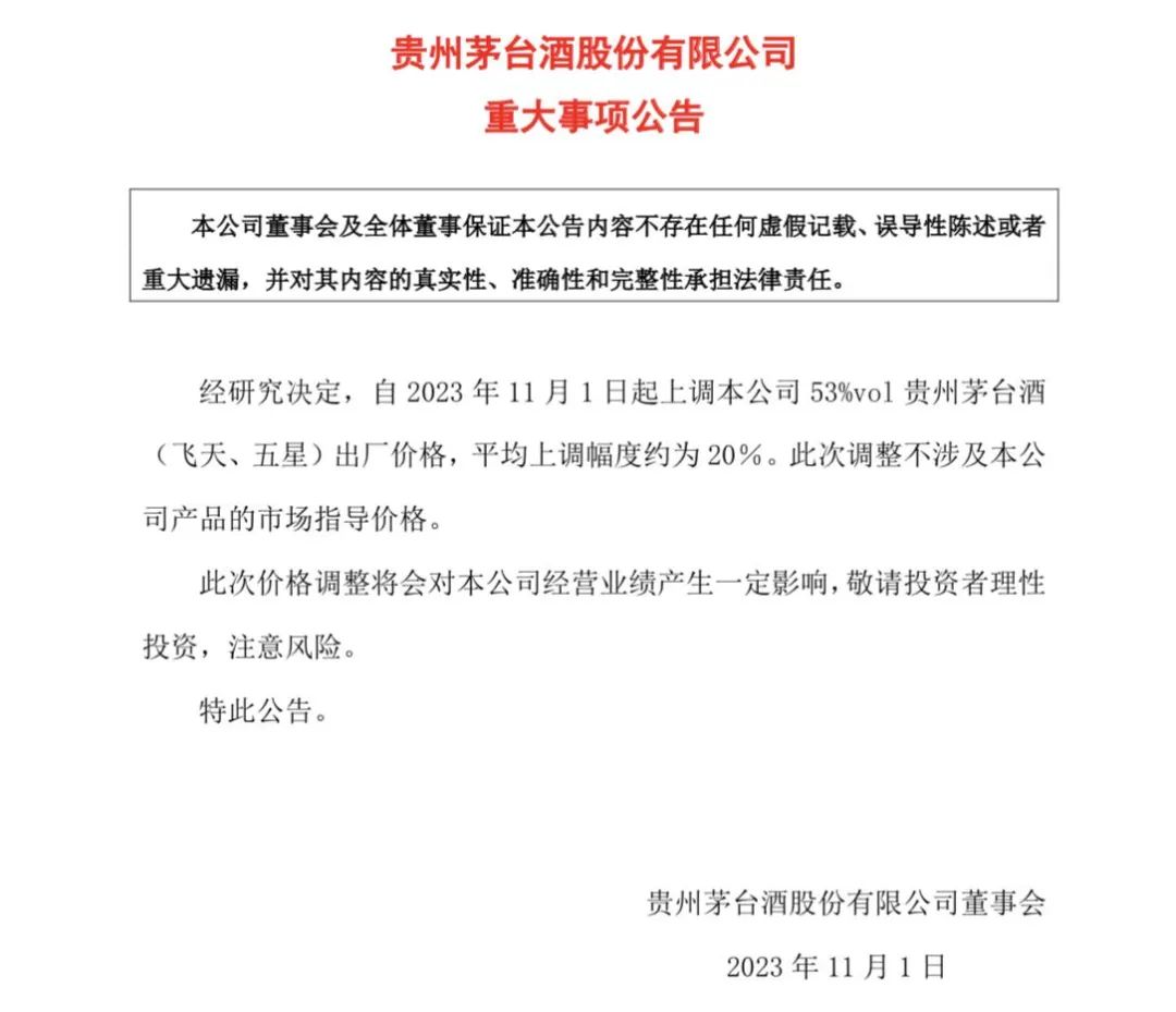 10月31日晚間,貴州茅臺(tái)發(fā)布公告,將于11月1日起,調(diào)整53%vol貴州茅臺(tái)酒(飛天、五星)出廠價(jià)格,平均上調(diào)幅度約為20%。