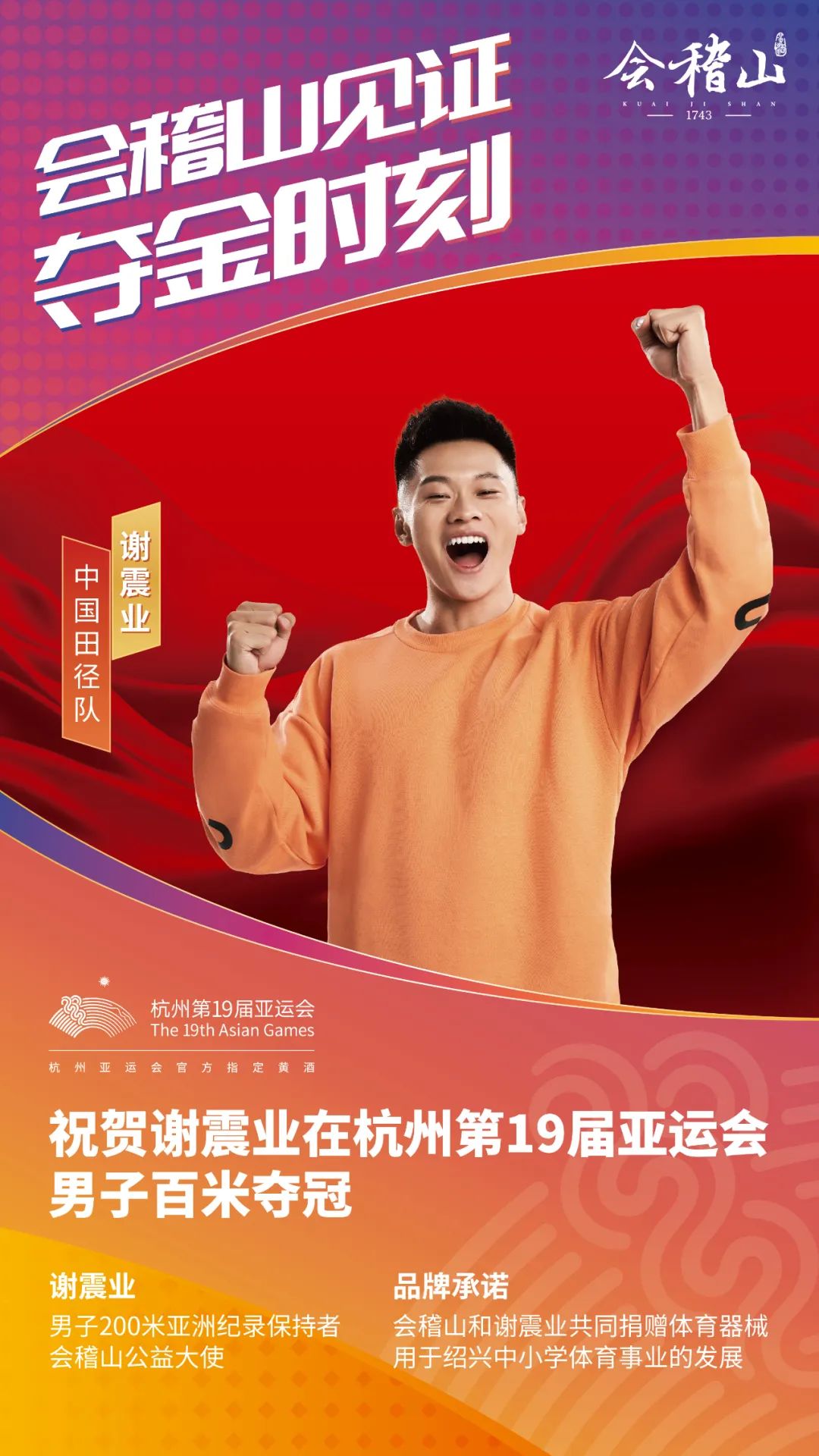 9月30日,杭州第19屆亞運會,男子百米決賽,中國選手謝震業以9秒97的成績奪下金牌!!突破10秒大關。當晚,會稽山紹興酒正式官宣謝震業成為品牌公益大使。