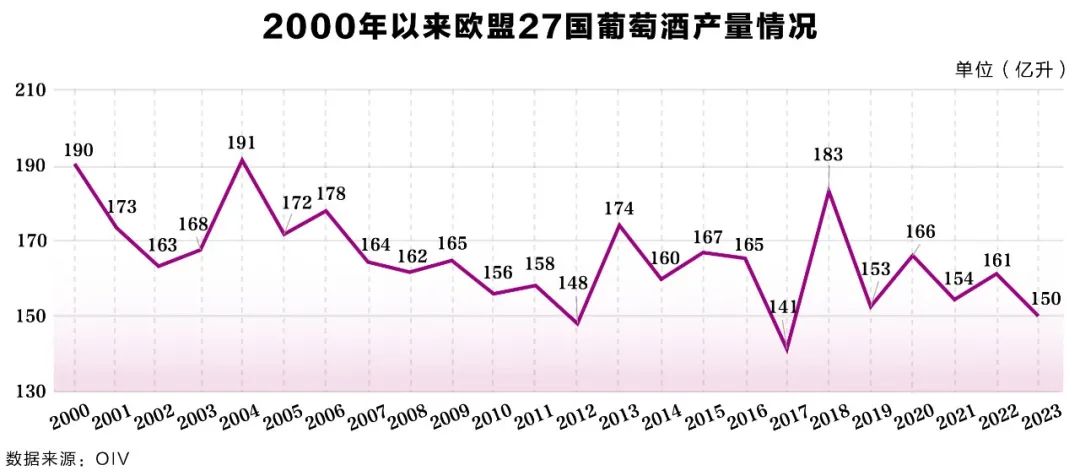 歐盟地區2023年的葡萄酒產量預計為150億升,同比減少11.2億升,比2022年低7%,比過去五年的平均水平低8%。