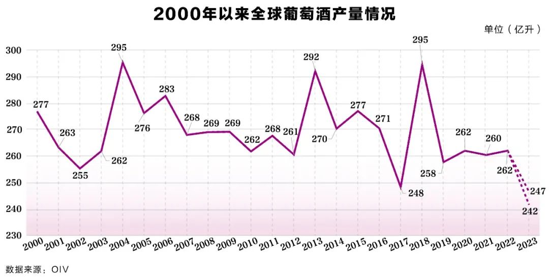 國際葡萄與葡萄酒組織(OIV)發布的全球最新葡萄酒產量預估報告顯示,2023年的葡萄酒產量估計約在241.7億升至246.6億升之間(取中間值為244.1億升)。與已經低于平均水平的2022年相比,這一數字下降了7%,這也是自1961年(214億升)以來的最低水平。