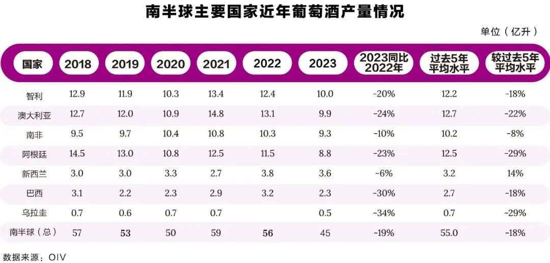 在經歷了2021年創紀錄的收成和2022年的產量相對下降之后,2023年南半球的葡萄酒產量估計為45億升,與2022年相比減少了19%,與過去5年平均水平相比也下降了18%。這是自2003年以來的最低產量記錄,可歸因為所有主要葡萄酒產區在生長季節發生的極端氣候事件。總體而言,到2023年,南半球的葡萄酒產量預計將占全球總產量的19%。