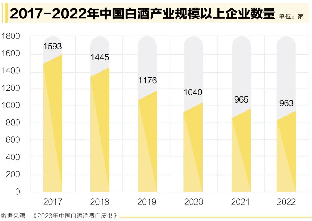 另有數(shù)據(jù)顯示,我國(guó)白酒行業(yè)規(guī)模以上企業(yè)數(shù)量逐年減少,由2017年的1593家降至2022年的963家,行業(yè)集中趨勢(shì)明顯。