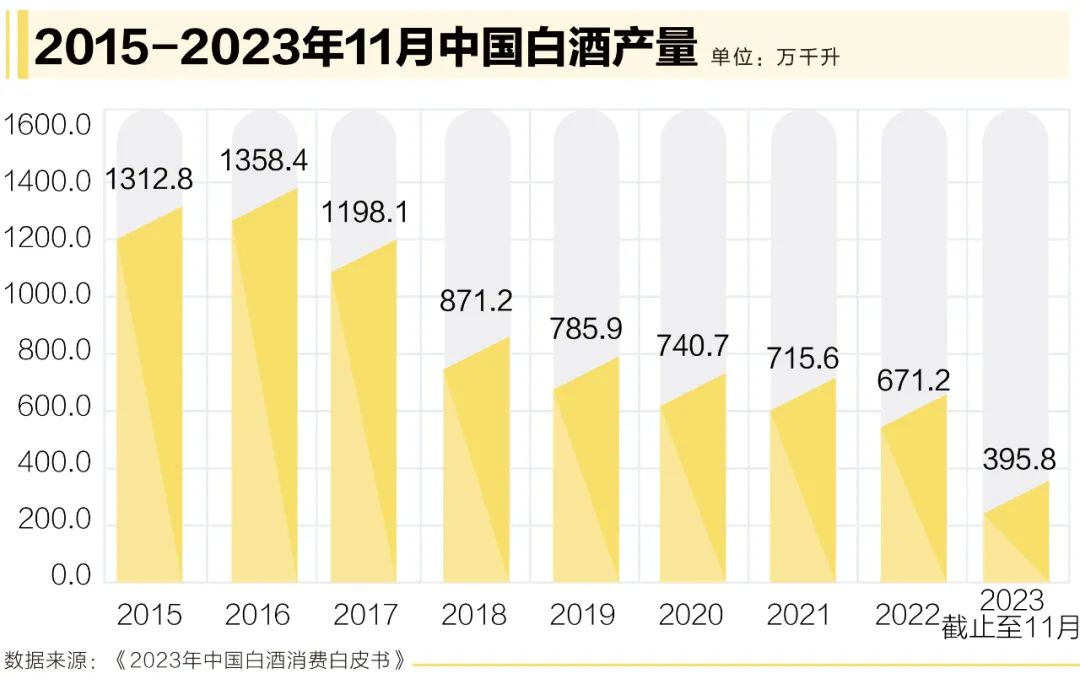 單就白酒來(lái)看,國(guó)家統(tǒng)計(jì)局?jǐn)?shù)據(jù)顯示,中國(guó)白酒產(chǎn)量自2016年以來(lái)已經(jīng)出現(xiàn)六連降,2022年全國(guó)規(guī)模以上白酒企業(yè)產(chǎn)量為671.24萬(wàn)千升,同比下降5.58%;2023年1-11月,全國(guó)規(guī)模以上白酒企業(yè)產(chǎn)量為395.8萬(wàn)千升,同比下降6.0%。