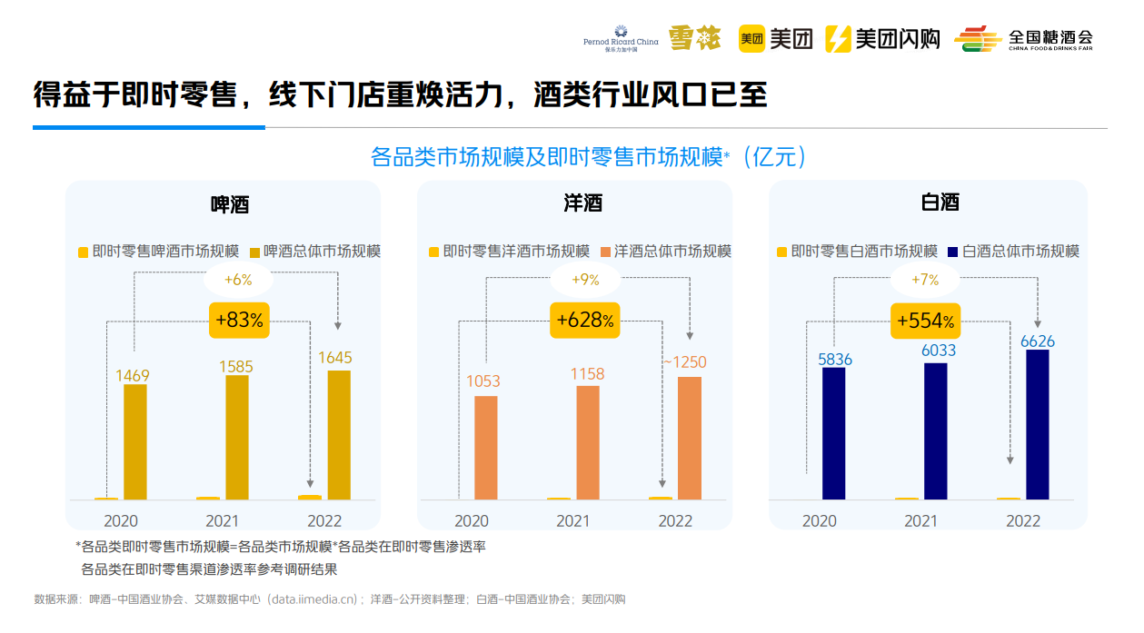 2023年4月,美團閃購聯(lián)合全國糖酒商品交易會、華潤雪花、保樂力加中國共同發(fā)布《2023即時零售酒類白皮書》。《白皮書》顯示,2020年至2022年,在即時零售市場規(guī)模中,啤酒增長83%、洋酒增長628%、白酒增長554%,遠高于酒水品類大盤增長。