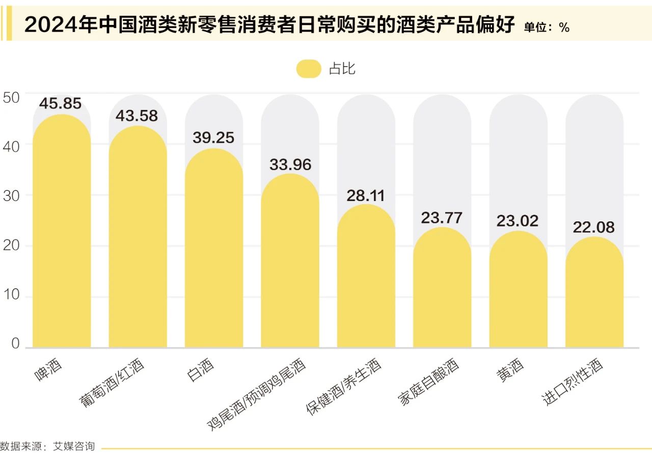 目前,酒類消費(fèi)市場(chǎng)呈現(xiàn)出顯著的多元化特征,各類酒類產(chǎn)品均擁有較為穩(wěn)定的消費(fèi)群體。數(shù)據(jù)顯示,在酒類產(chǎn)品消費(fèi)偏好上,啤酒以45.85%的占比位居首位,緊隨其后的是葡萄酒/紅酒和白酒,分別獲得了43.58%和39.25%消費(fèi)者的青睞。另外,雞尾酒/預(yù)調(diào)雞尾酒(33.96%)、保健酒/養(yǎng)生酒(28.11%)、家庭自釀酒(23.77%)、黃酒(23.02%)以及進(jìn)口烈性酒(22.08%),也展現(xiàn)出一定的市場(chǎng)吸引力。
