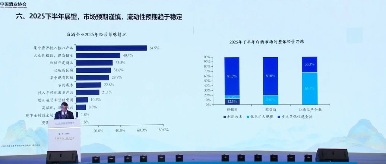 展望2025年下半年,80%以上的經(jīng)銷商和零售商認(rèn)為,下半年其核心經(jīng)營(yíng)思路是“重點(diǎn)保住現(xiàn)金流”;僅12.5%的經(jīng)銷商選擇“利潤(rùn)為王”的經(jīng)營(yíng)思路,白酒生產(chǎn)企業(yè)下半年的主要經(jīng)營(yíng)思路則為“優(yōu)先擴(kuò)大規(guī)?!?。