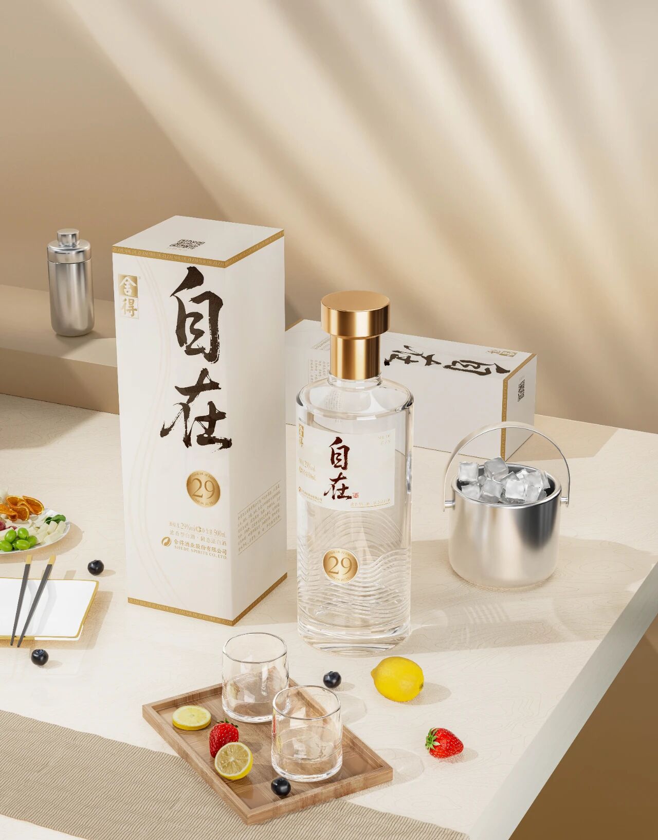 其四,高顏值設計。瓶身設計摒棄繁復,舍得自在采取通透瓶體,顏值依舊能打,新中式東方韻味與極簡現代風格兼具,給人“低度輕盈”的感官認知;醒目的29度金色標識,傳達“低酒度無壓力”的產品特性,降低消費者對飲用白酒的心理門檻。