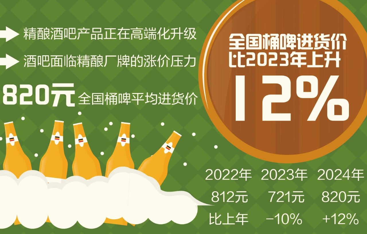 《白皮書》調研顯示,2024年,中國精釀酒吧產品呈現(xiàn)出高端化升級趨勢,酒吧面臨精釀廠牌漲價壓力。調研數據顯示,全國桶啤的平均進貨價為820元,較2023年上升12%。